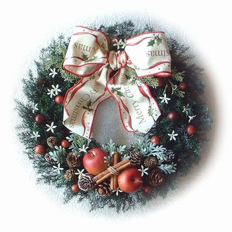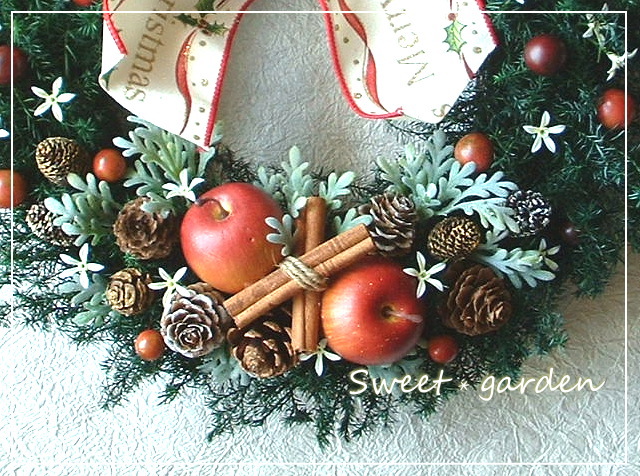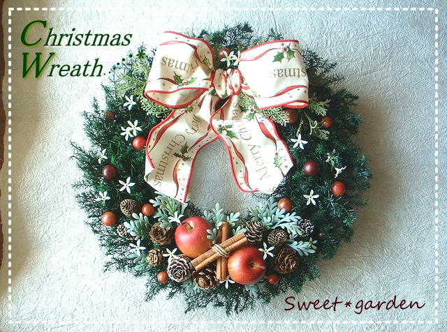 | ◆直径約31センチの、プリザーブドグリーンを使った ボリュームのあるクリスマスリース。 プリザーブドの深みのあるグリーンに、アーティフィシャルの 色味の違うグリーンを加えてナチュラルに。 赤いアップルとシナモン、木の実の組み合わせの中に 散りばめた白い小花がとってもキュート♪ |