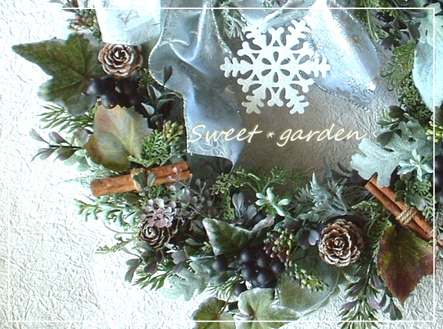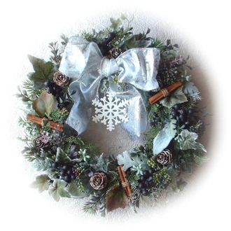 | ◆直径約31センチ。 アーティフィシャルならではの美しい微妙な色合いの グリーンに。木の実・青い実やシナモンなどをアレンジし スノーフレークのオーナメントをプラス。 微妙にパープルがかったアイビーとスモーキーグリーンの 葉がシックな大人の雰囲気を醸し出します。 |