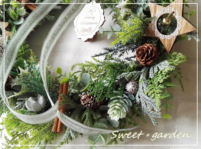 | ◆何種類もの色味の違うグリーンを使うことによって リースにナチュラルな深みを出しています。 シナモンと木の実がグリーンに映えて、とてもナチュラル。 白いドアにもブラウン系のドアにも似合う 存在感たっぷりのクリスマスリースです。 |