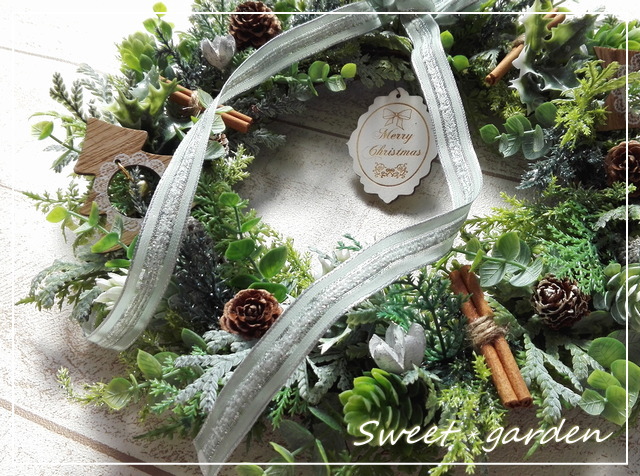 | ◆直径約32センチの、キラキラ光るフロスト感のある 針葉樹のきらめきがシックなクリスマスリース。 ミントブルーのリボンがナチュラルテイストのクリスマスに ぴったり。 きれいなベースのグリーンが、木の実とシナモンを 引き立てる、華やか過ぎない大人の雰囲気のリースです。 |