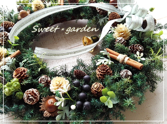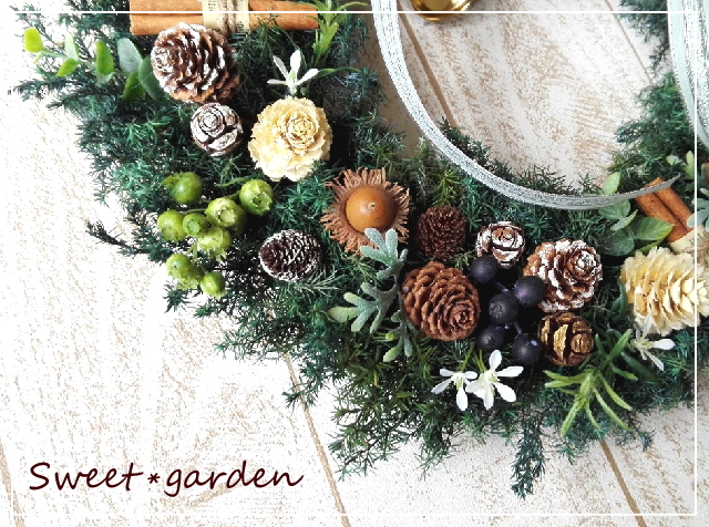 | ◆ボタンのような、まぁ〜るいメタセコイアをホワイトとゴールドに フロストして、クリスマスっぽさをプラス。 麻ひもを巻いたシナモンと木の実がグリーンに映えて とてもナチュラルな雰囲気です。 |