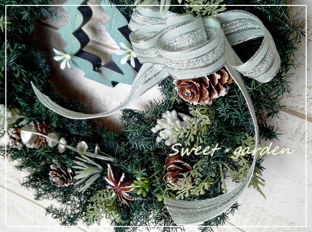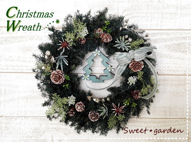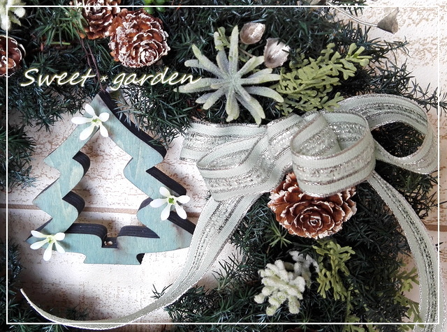 | ◆直径約26センチの、プリザーブドグリーンを使った シックなクリスマスリース。 プリザーブドの深みのあるグリーンに、アーティフィシャルの 色味の違うグリーンを加えてナチュラルな仕上がりに。 リボンのミントブルーと、かわいい白い小花をつけた同系色の 木製のツリー型オーナメントをプラスしました。 |