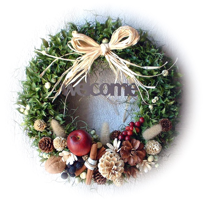 ナチュラルでさわやかな色合いを長く楽しんでいただける、アーティフィシャル素材を使ったリースです。 (※飾っていただく状況・日数などによっては多少の色あせ・劣化はご承知おき下さい 近くに寄らないとフェイクとは気づかないほど、みずみずしいグリーン&木の実のリースです。 グリーンをベースに、フェイクアップル・木の実・シナモン・クルミなどでアレンジしました。 玄関ドア・門扉などに飾って、エントランスをナチュラルに演出しましょう。 ≪ ドライ ・プリザーブド ・アーティフィシャル素材のちがいはこちらから ≫ |