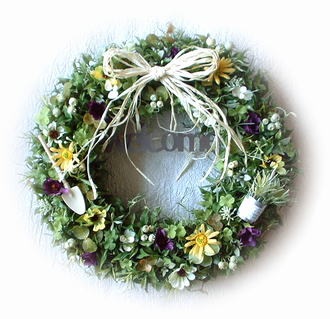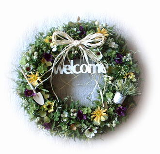 ナチュラルでさわやかな色合いを長く楽しんでいただける、アーティフィシャル素材を使ったリースです。 (※飾っていただく状況・日数などによっては多少の色あせ・劣化はご承知おき下さい) 近くに寄らないとフェイクとは気づかないほど、みずみずしいリースです。 さわやかなグリーンの中に、ホワイト・イエロー・パープルのデージーをメインに かわいいシャベルとバケツをアレンジしました。 玄関ドア・門扉などに飾って、エントランスをナチュラル&エレガントに演出しましょう。 (※イエローデージーが若干違うタイプに変更になりますが、同じイメージの仕上がりになります。) ≪ ドライ ・プリザーブド ・アーティフィシャル素材のちがいはこちらから ≫ |