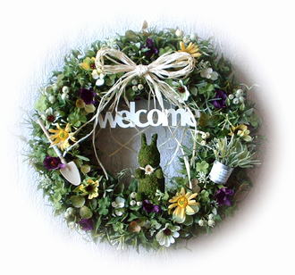 ●アイアンウェルカムプレートとモスラビットをアレンジ 数種類のグリーンの中に、かわいいデージーをメインにブリキのバケツとシャベル、モスラビット、アイアンのウェルカムプレートをアレンジ。玄関ドア ・ 門扉などに飾って、エントランスにナチュラルなイメージをプラスしましょう。 ※花材が多少変更になる場合がありますが、同じイメージの仕上がりになります。
