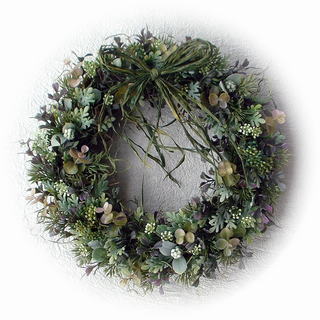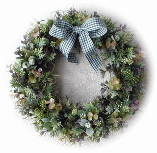 ●グリーンチェックリボンをアレンジ 繊細で微妙な色合いのグリーンを何種類も使い、雰囲気のあるナチュラルでシックなリースに、グリーンチェックのリボンをプラスしました。