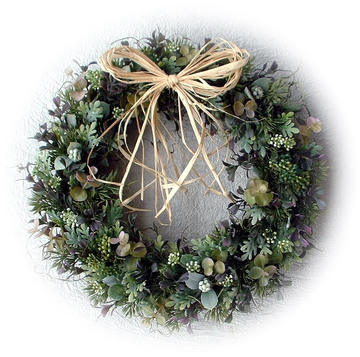 ●きなりラフィアリボンをアレンジ 繊細で微妙な色合いのグリーンを何種類も使い、雰囲気のあるナチュラルでシックなリースに、定番のきなりのラフィアリボンをプラスしました。