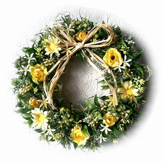 ナチュラルでさわやかな色合いを長く楽しんでいただける、アーティフィシャル素材を使ったリースです。 (※飾っていただく状況・日数などによっては多少の色あせ・劣化はご承知おき下さい) 近くに寄らないとフェイクとは気づかないほどみずみずしい何種類ものグリーンの中に、イエローと ホワイト小花でアレンジした、ナチュラルでちょっと小ぶりの明るいリースです。 お部屋はもちろん、玄関ドア・門扉などに飾って、エントランスをナチュラルに演出しましょう。 ≪ ドライ ・プリザーブド ・アーティフィシャル素材のちがいはこちらから ≫ |