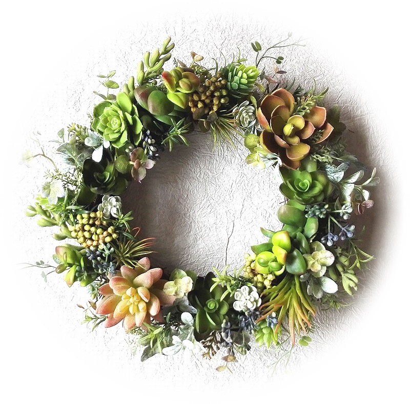 ナチュラルでさわやかな色合いを長く楽しんでいただける、アーティフィシャル素材を使ったリースです。 (※飾っていただく状況・日数などによっては多少の色あせ・劣化はご承知おき下さい) 近くに寄ってもフェイクとは気づかないほどナチュラルでみずみずしい、 人気のアーティフィシャル素材の多肉植物を使った、少し小さい直径約25センチサイズのリースです。 スモーキーなトーンや透明感あるグリーンなど、色味の微妙に違う多肉植物のアレンジで お部屋はもちろん、玄関ドア・門扉などに飾ってエントランスをナチュラルに演出しましょう。 ≪ ドライ ・プリザーブド ・アーティフィシャル素材のちがいはこちらから ≫ |