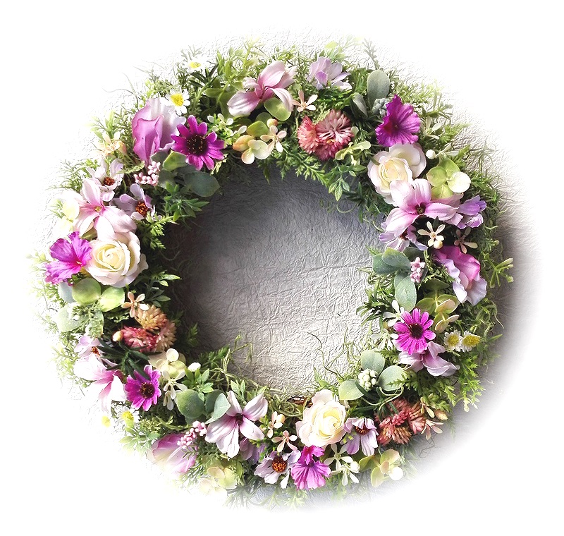 | ナチュラルでさわやかな色合いを長く楽しんでいただける、アーティフィシャル素材を使ったリースです。 (※飾っていただく状況・日数などによっては多少の色あせ・劣化はご承知おき下さい) 近くに寄らないとフェイクとは気づかないほど、ナチュラルでみずみずしいグリーン&ピンクパープル系のリースです。 お部屋はもちろん、玄関ドア・門扉などに飾って、エントランスをナチュラルに演出しましょう。 ※お部屋に飾っていただいた場合、より長くみずみずしい色合いを保てます。 ≪ ドライ ・プリザーブド ・アーティフィシャル素材のちがいはこちらから ≫ |