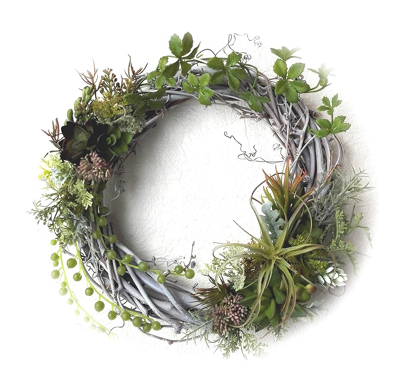 ナチュラルでさわやかな色合いを長く楽しんでいただける、アーティフィシャル素材を使ったリースです。 (※飾っていただく状況・日数などによっては多少の色あせ・劣化はご承知おき下さい) 近くに寄ってもフェイクとは気づかないほどナチュラルでみずみずしい、 人気のアーティフィシャル素材の多肉植物のリースです。 スモーキーなトーンや透明感あるグリーンなど、色味の微妙に違う多肉植物のアレンジで お部屋はもちろん、玄関ドア・門扉などに飾って、エントランスをナチュラルに演出しましょう。 ※お部屋に飾っていただいた場合、より長くみずみずしい色合いを保てます。 ≪ ドライ ・プリザーブド ・アーティフィシャル素材のちがいはこちらから ≫ |