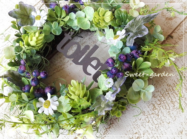 | ◆ナチュラルで繊細な色合いを長く楽しんでいただけるアーティフィシャル素材を使った直径約19センチの、「toilet」のアイアンプレートをつけたリースです。 ◆ユーカリなどのナチュラルなグリーンをメインに、ブルーパープルの実と白い小花がトイレを爽やかな空間に♪ グリーン・ブルーバープル・ホワイトのコントラストが、清潔感のある空間を演出。 トイレのドアに飾れば、おうちの素敵なインテリアになります。 |