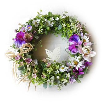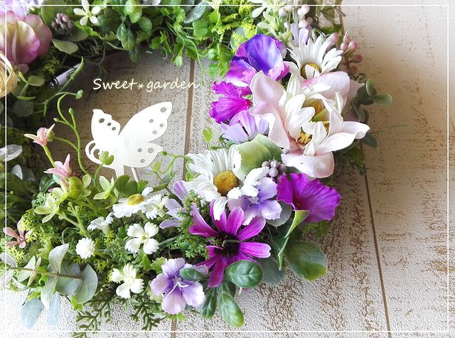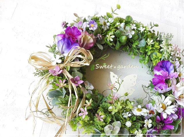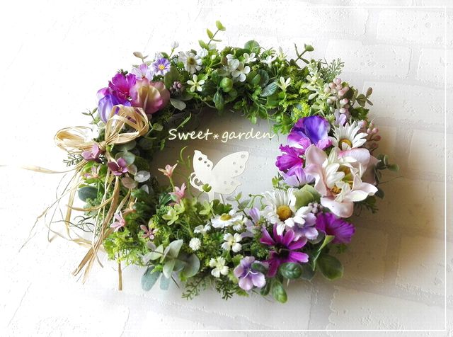 | ◆ナチュラルで繊細な色合いを長く楽しんでいただけるアーティフィシャル素材を使った、直径約25センチのリースです。 ◆ピンク・パープル系のスイートピーをメインに白いデージーや小花を散りばめました。 アイアンの白いバタフライピックがエレガントな雰囲気をプラス:.。.:*:・'゜ グリーン・ピンク・ホワイトのコントラストが大人可愛い、フェミニンなリースです。 玄関ドアやリビングの素敵なアクセントに! |