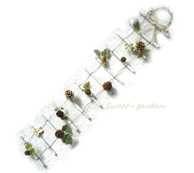 白くペイントした枝を細いワイヤーで繋げて、かわいい木の実と葉っぱでアレンジ。