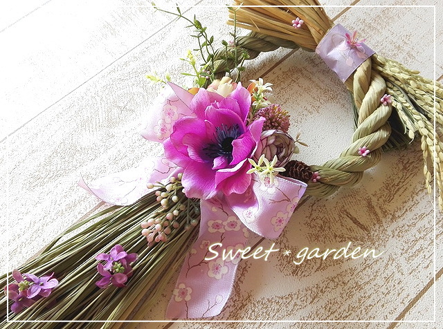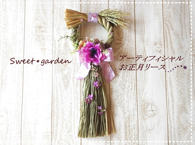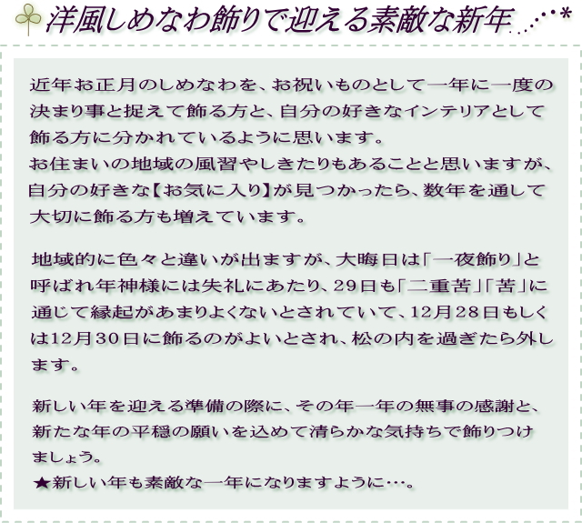 | ◆新年を迎えるにふさわしい、明るく華やかな洋風しめなわを飾って・・・。 みなさまにとって、新しい年が素敵な一年になりますように☆ |