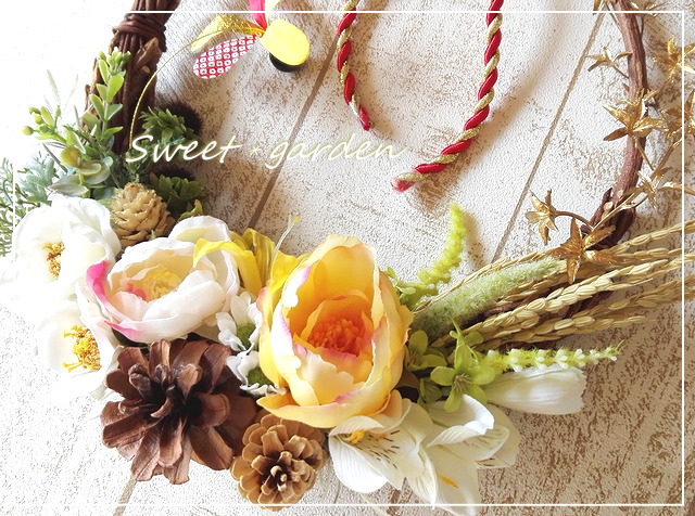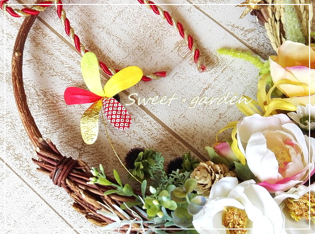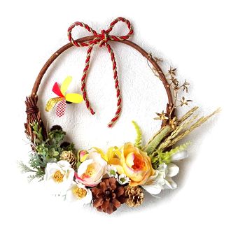 | ◆ベース左右/約24センチ・高さ/約28センチ(花材含む) ◆アーティフィシャル素材ならではのきれいな色の花材と天然素材の 稲穂・木の実を使ったお正月飾りです。 和紙の追羽根ピックや椿などの花を使い、明るくやさしい雰囲気を醸し出す ちょっぴり和風アレンジのお正月飾りで、新しい年を華やかに! ※こちらの商品は1点のみとなります。 |
