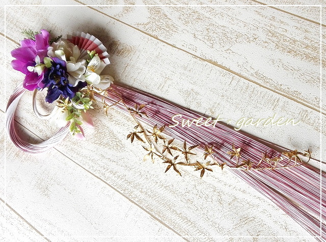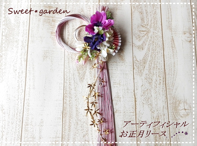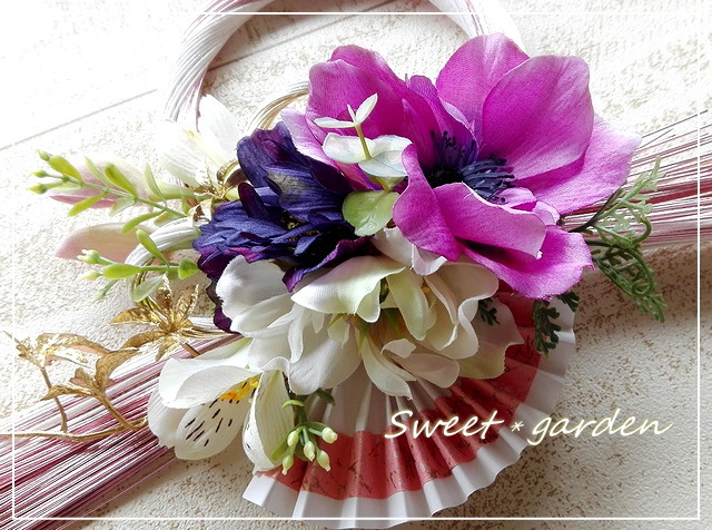 | ◆ヨコ約19センチ・タテ約44センチ ◆ピンクのゴージャスな水引きに、アーティフィシャル素材ならではの きれいな色の花材と扇をアレンジした華やかなお飾りです。 アネモネなどピンク・パープル系の花をメインに、流れるように垂らした ゴールドの葉がピンクの水引きを引き立てます。 洋と和をミックスした、よそのお宅とは違ったおしゃれなしめなわで 明るく華やかな新年をお迎えください! ※こちらの商品は1点のみとなります。 |