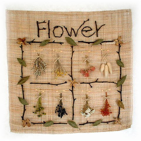 束ねた花材の上部に、花名入りのラベルが貼ってあります。